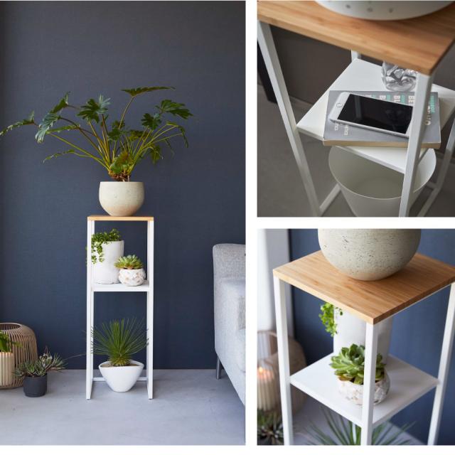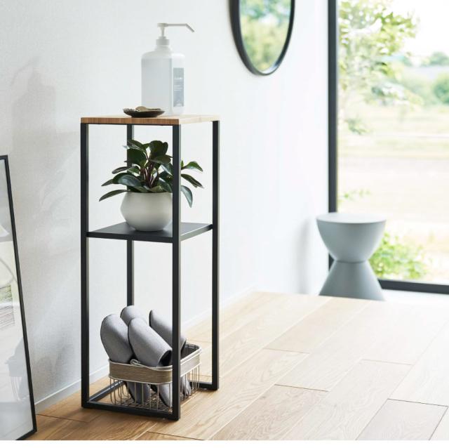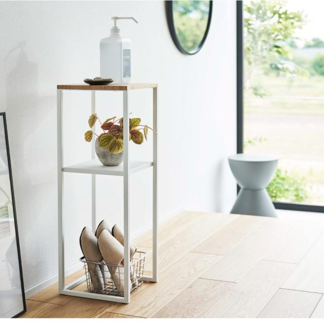 寝室などで、棚は小物置きとして、下段はゴミ箱の置き場所としても活用できます。リビングや玄関で、アルコールなどの除菌グッズや観葉植物を置いても。