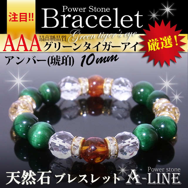 パワーストーン ブレスレット 金運UP アンバー(琥珀)&AAAグリーンタイガーアイ10mm PW-3490