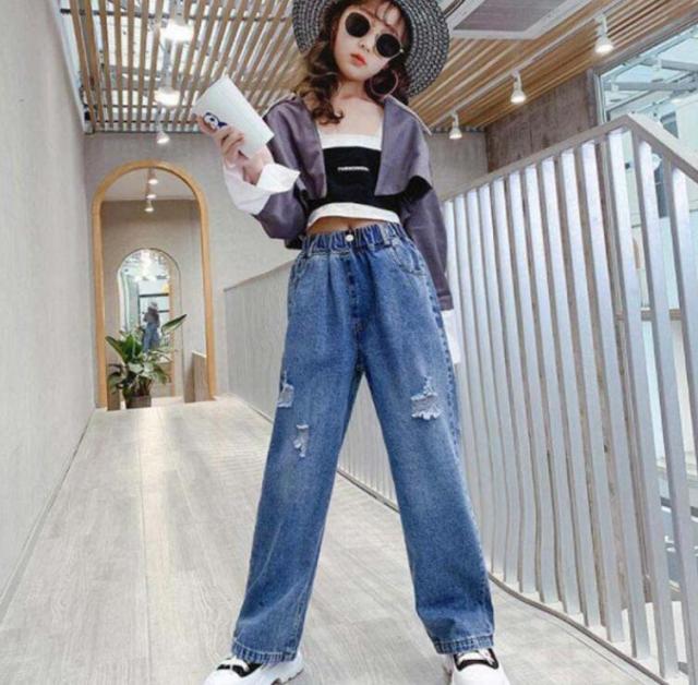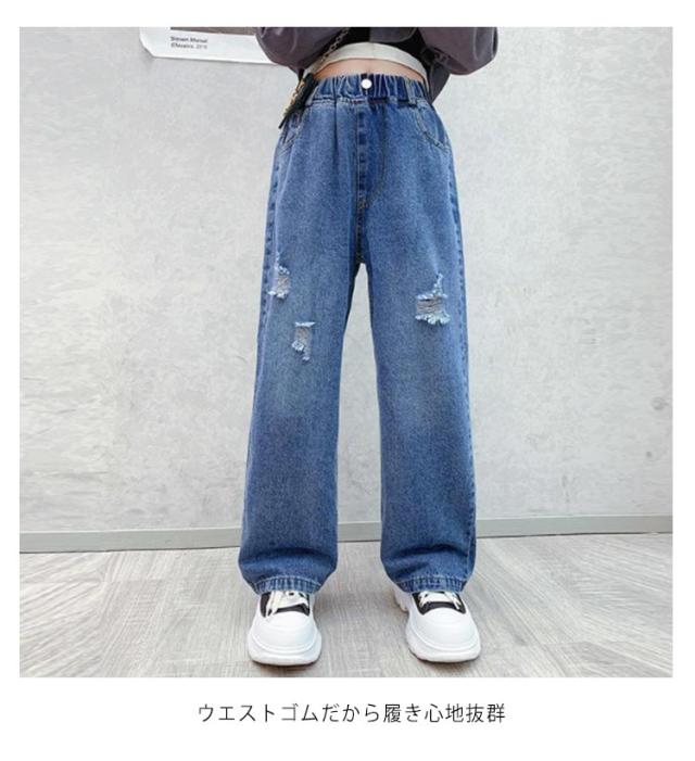 キッズ ワイド デニムパンツ 韓国こども服 長ズボン ジーンズ こども おしゃれ ジーパンダメージ ジーンズ ボトムス 子ども服 幼稚園 小学生 中学生 子供 服 女の子 男の子 ガールズ ジュニア 子供服