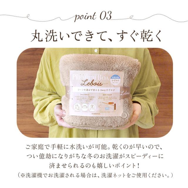 | 商品説明 | ・リッチな触り心地とプレミアムなあたたかさ♪マルチに使える「Lebois(ルボア)3wayひざかけ」が新登場。 ・「Lebois(ルボア)」とは、フランス語で「森」を意味する言葉。密集した森を上から見たような高密度のボア生地を「ルボア」と命名。 ・1人分にぴったりな約100cm×70cmサイズ。 ・ひざかけとしてはもちろん、肩から羽織ってポンチョ風に、サイドのボタンを留めてボレロ風にも使える3wayタイプ♪ ・とっても軽量な両面起毛素材。コンパクトなので持ち運びもラクラク。 ・超極細繊維が、頬ずりしたくなるような滑らかな肌触りの秘密♪約10mmの長い毛足が空気をたっぷり含むことで、贅沢なボリューム感に。 ・繊維が高密度で織り込まれているので、熱を逃さず保温性抜群◎身につけた瞬間から、とろけるようなあたたかさを実感♪ ・汚れが気になったら、洗濯ネットに入れて水洗いOK!(※洗濯機の弱モードを使用してください。) ・乾くのが早めなところも、冬のお洗濯では嬉しいポイント。 ・車内やオフィスで使ったり、アウトドア時の防寒対策にもおすすめ。 |