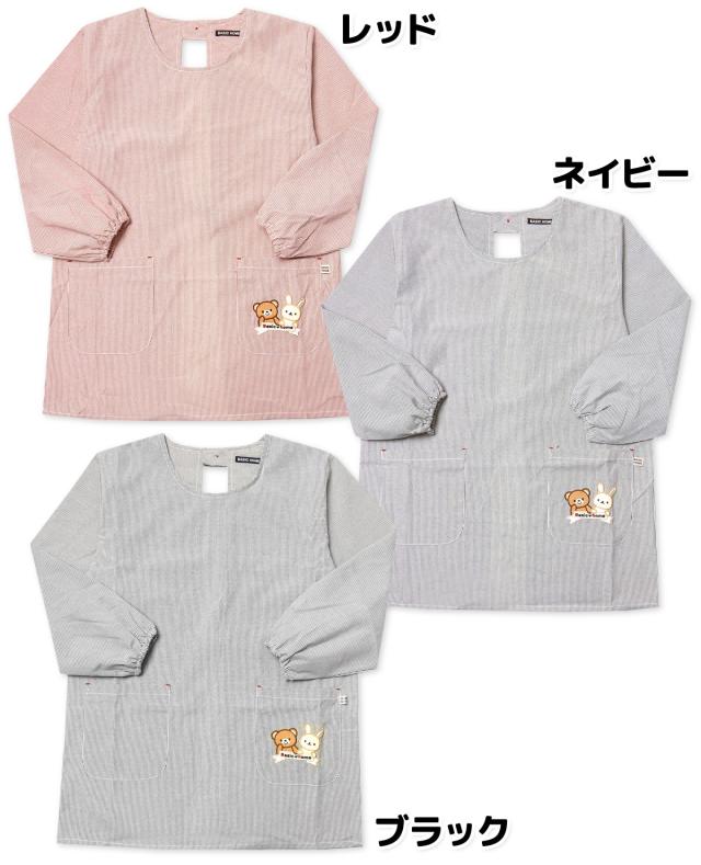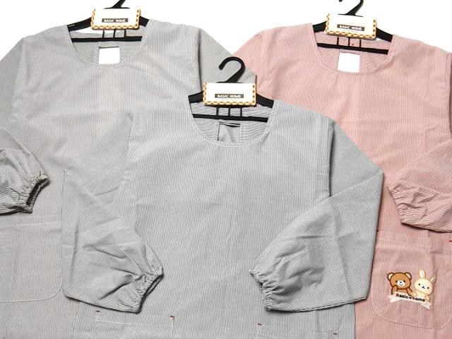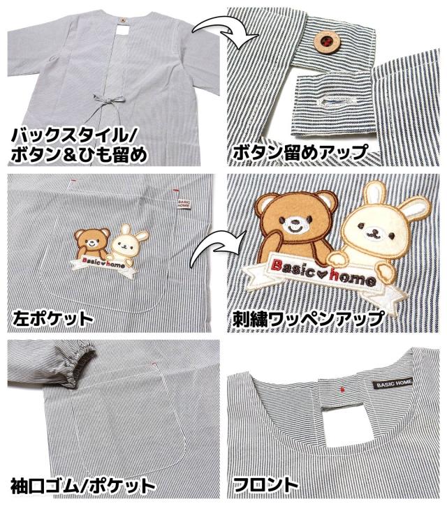 【送料無料】婦人 レディース 割烹着 エプロン 先染めストライプ 後ろボタン&ひも留め くま&うさぎ刺繍ワッペン sl-0191【メール便対応】