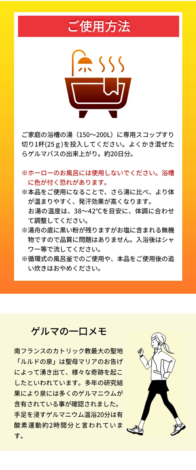ご家庭の浴槽の湯(150〜200L)に、付属の計量スコップで25gを投入してください。よくかき混ぜたらゲルマバスの出来上がり。約20日分。 |