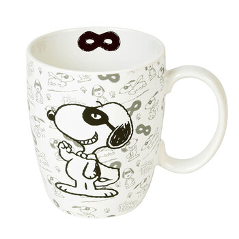 スーパーヒーローのマスクを身に着けたスヌーピーがたくさん描かれたマグカップです。