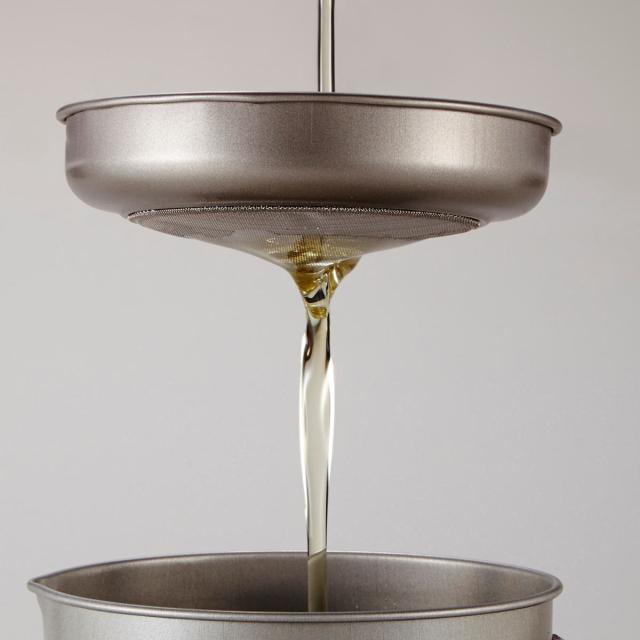 アミ中央部の特殊形状で油が早く落ちるオイルポットです。ステンレスメッシュのえくぼが油の落ちるスピードを早めるポイントになっています。落ちるスピードが2倍程度早まるので、油の移し替えがスムーズにでき、後片付けの時短にも繋がります。
