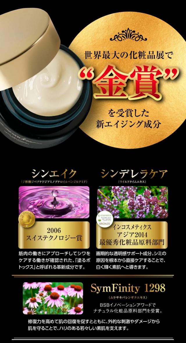 | 商品説明 | 世界最大の化粧品展で金賞を受賞したエイジングケア成分を配合した15役の高級オールインワンクリーム |