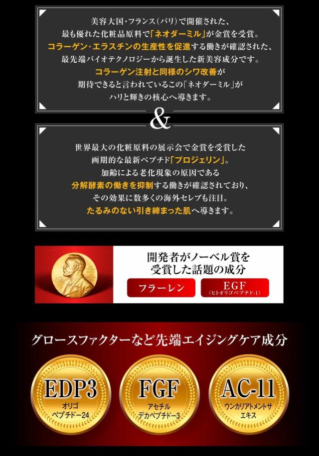 | 全成分 | 水、BG、グリセリン、トリエチルヘキサノイン、ジメチコン、スクワラン、メチルグルセス−10、ヒト遺伝子組換オリゴペプチド−1、ヒト遺伝子組換ポリペプチド−3、ヒト遺伝子組換ポリペプチド−11、ウンカリアトメントサエキス、合成ヒト遺伝子組換ポリペプチド−31、ヒト遺伝子組換ポリペプチド−2、ジ酢酸ジペプチドジアミノブチロイルベンジルアミド、ワイルドタイムエキス、ムラサキバレンギクエキス、メチルグルコシドリン酸、(リシン/プロリン)銅、トリフルオロアセチルトリペプチド−2、フラーレン、ヒアルロン酸ヒドロキシプロピルトリモニウム、ポルフィリジウムクルエンタムエキス、テトラヘキシルデカン酸アスコルビル、加水分解コラーゲン、水溶性コラーゲン、サクシノイルアテロコラーゲン、セラミドNG、セラミドNP、セラミドAP、セラミドEOP、プラセンタエキス、ユビキノン、プルラン、パルミトイルテトラペプチド−7、パルミトイルトリペプチド−1、3−O−エチルアスコルビン酸、パルミチン酸アスコルビルリン酸3Na、シアノコバラミン、アルブチン、フィトスフィンゴシン、アルニカ花エキス、アーチチョーク葉エキス、セイヨウニワトコ花エキス、イチョウ葉エキス、水溶性プロテオグリカン、アロエベラ葉エキス、クロレラエキス、パリエタリアエキス、ノイバラ果実エキス、ダイズ種子エキス、チオクト酸、ワレモコウエキス、セイヨウキズタ葉/茎エキス、キュウリ果実エキス、メマツヨイグサ種子エキス、ソメイヨシノ葉エキス、馬油、シクロペンタシロキサン、ゼニアオイ花エキス、センキュウ根茎エキス、ベニバナ花エキス、キハダ樹皮エキス、マグワ根皮エキス、フランスカイガンショウ樹皮エキス、サッカロミセスセレビシアエエキス、セイヨウオトギリソウ花/葉/茎エキス、トレハロース、トウキ根エキス、シャクヤク根エキス、アイ葉/茎エキス、アロエフェロックス葉エキス、カンゾウ根エキス、オタネニンジン根エキス、オウゴン根エキス、チョウジエキス、ローズマリー葉エキス、チャ葉エキス、アシタバ葉/茎エキス、クララ根エキス、ボタンエキス、ユキノシタエキス、クズ根エキス、レモン果実エキス、ホップエキス、セイヨウアカマツ球果エキス、スギナエキス、PG、クエン酸、クエン酸Na、グレープフルーツ果皮油、ラウロイルラクチレートNa、ダイズステロール、デキストラン、アルギニン、グルコン酸Na、マルトデキストリン、ココイルサルコシンNa、水添レシチン、ステアリン酸グリセリル(SE)、ポリソルベート20、PEG−60水添ヒマシ油、ポリソルベート60、コレステロール、ヒドロキシプロピルメチルセルロース、ヒドロキシエチルセルロース、(アクリル酸ヒドロキシエチル/アクリロイルジメチルタウリンNa)コポリマー、キサンタンガム、カルボマー、ベヘニルアルコール、PVP、1,2−ヘキサンジオール、ペンチレングリコール、エタノール、フェノキシエタノール |