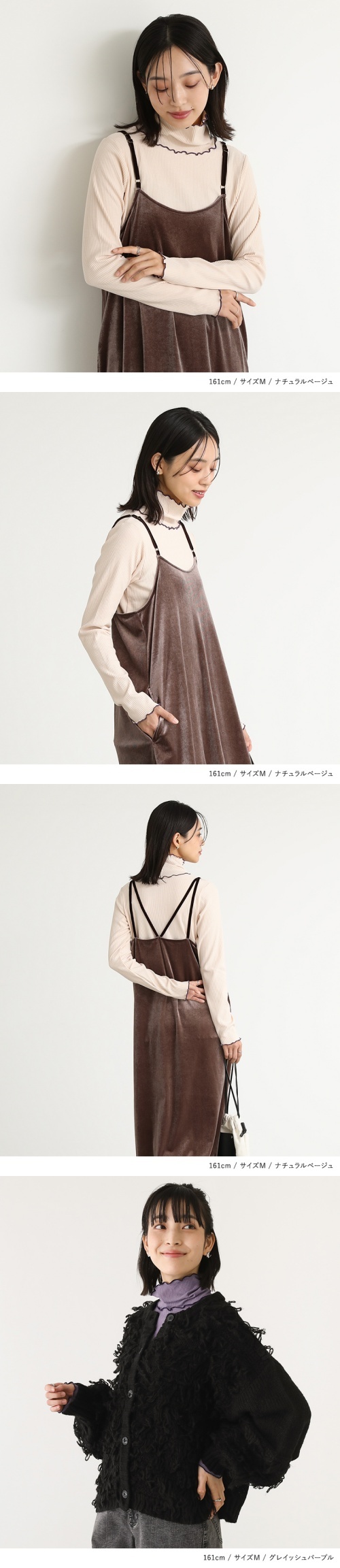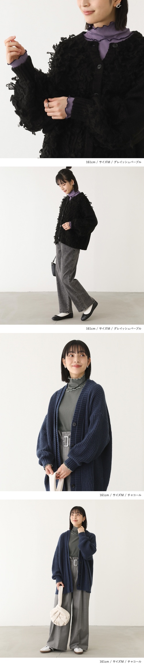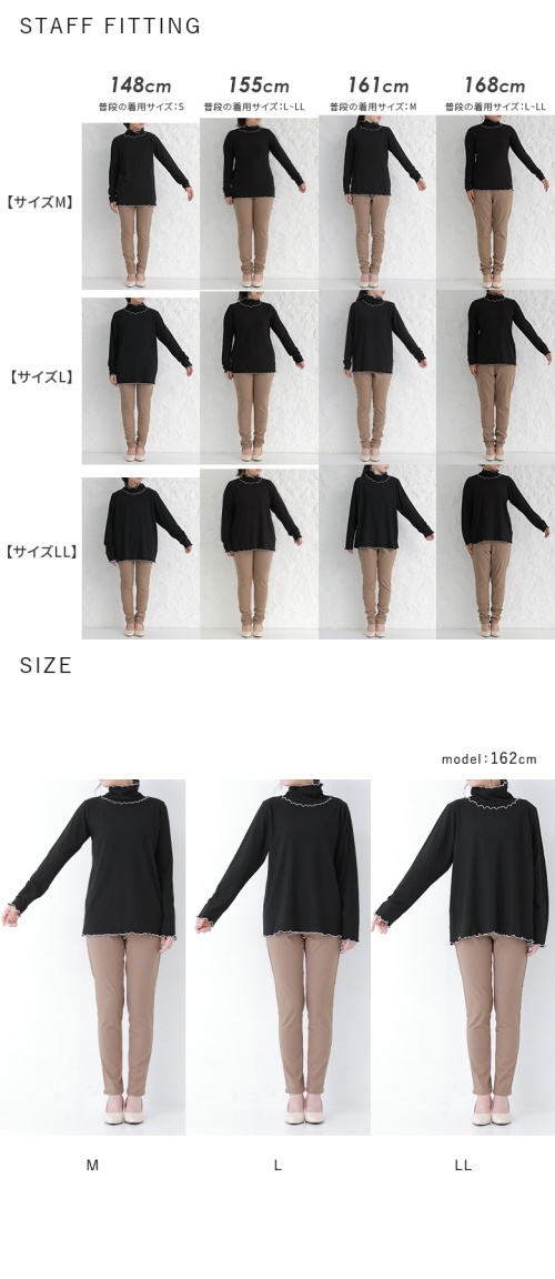 | staff:C/158cm 【普段着用】 トップス: M ボトムス: M | 【Mサイズ】 ◆袖丈:手の甲が隠れる位 ◆着丈:ヒップの真ん中位 【Lサイズ】 ◆袖丈:手の甲が隠れる位 ◆着丈:ヒップの下が見える位 【LLサイズ】 ◆袖丈:指の真ん中位 ◆着丈:ヒップが隠れる位 Mサイズはジャストなサイズ感ですが、良く伸びるので窮屈感なく着られました。レイヤードして着たいサイズ感でした。Lサイズは程よいゆとりで楽に着られました。LLサイズは大きすぎないゆったり感で着られますが、インナーとしては少し大きく感じるサイズ感でした。私の場合は1枚で着るならLサイズを選びますが、首元のくしゅ感はMサイズの方がスッキリ見えたのでインナーとして着るならMサイズ、1枚で着るならLサイズを選びます♪ |