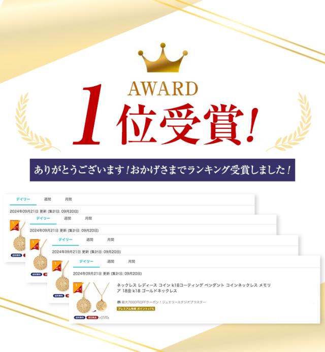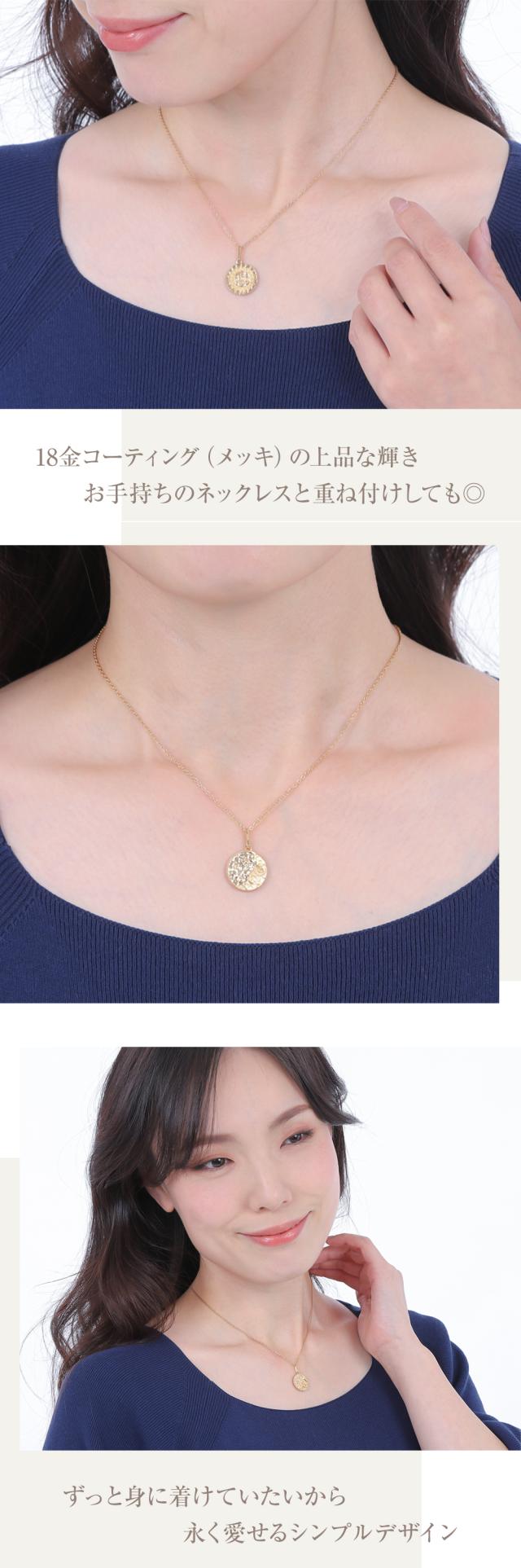 存在感のある人気のコインジュエリー。レリーフ模様の施された上品なデザイン。18金コーティング(メッキ)の上質な質感。重ね付け(レイヤード)にもオススメです。大切なひとや大切なわたしへ贈る、記憶のジュエリー。