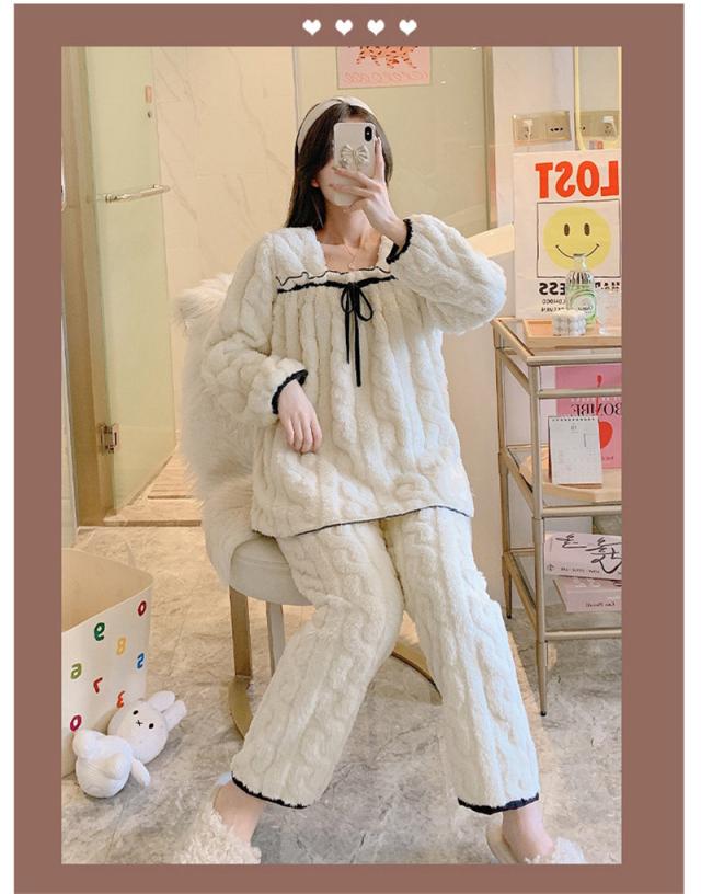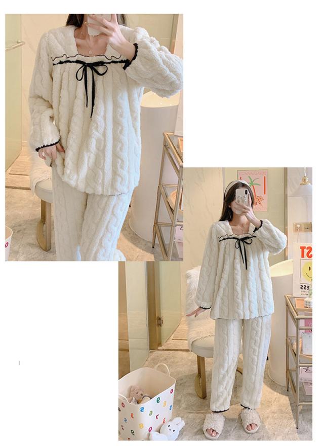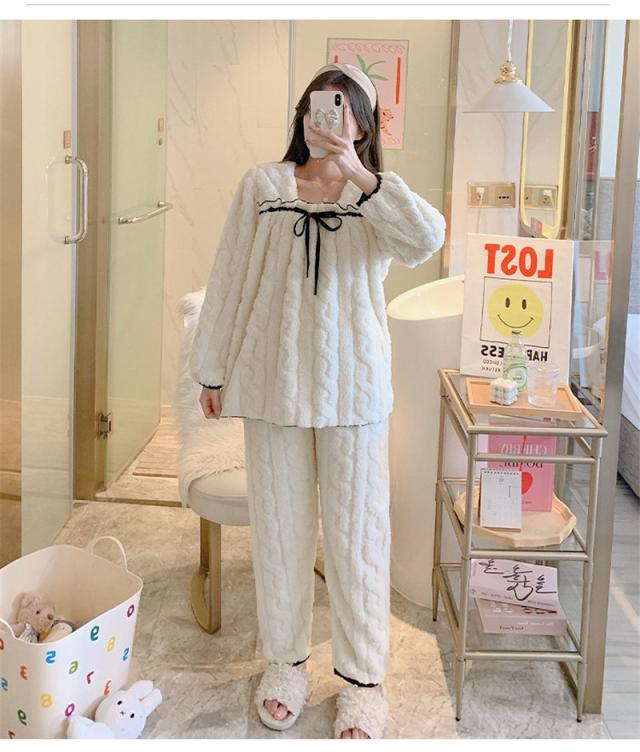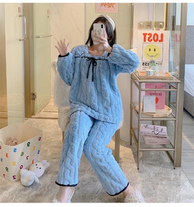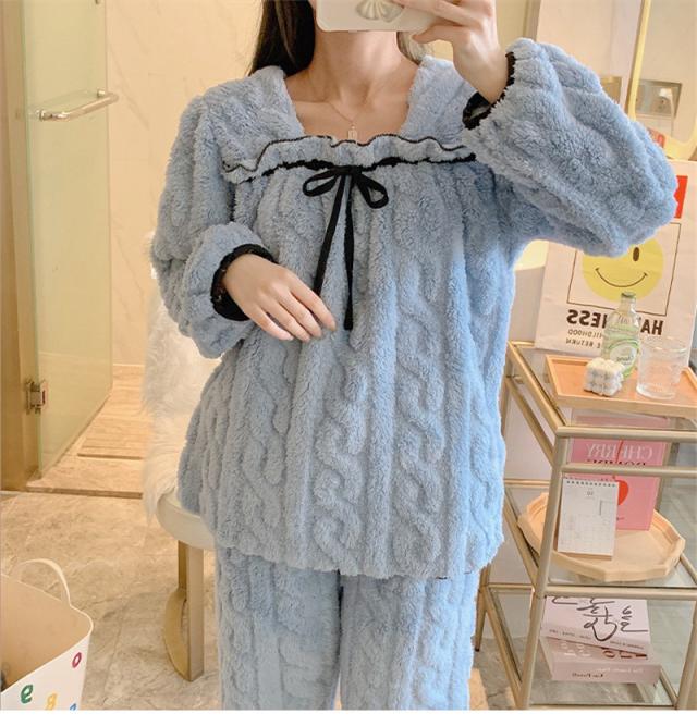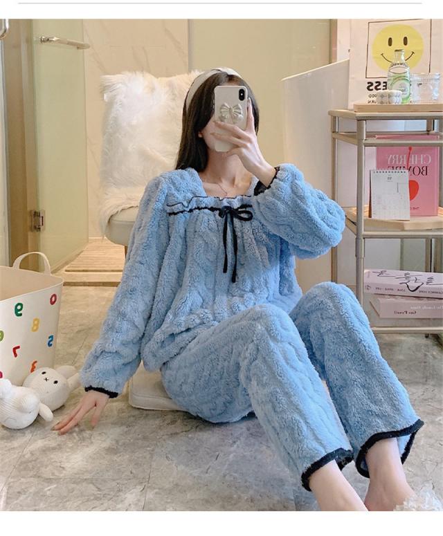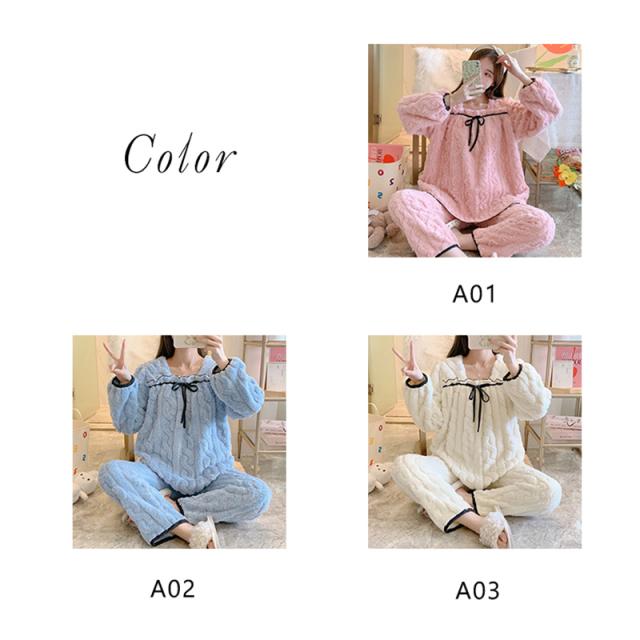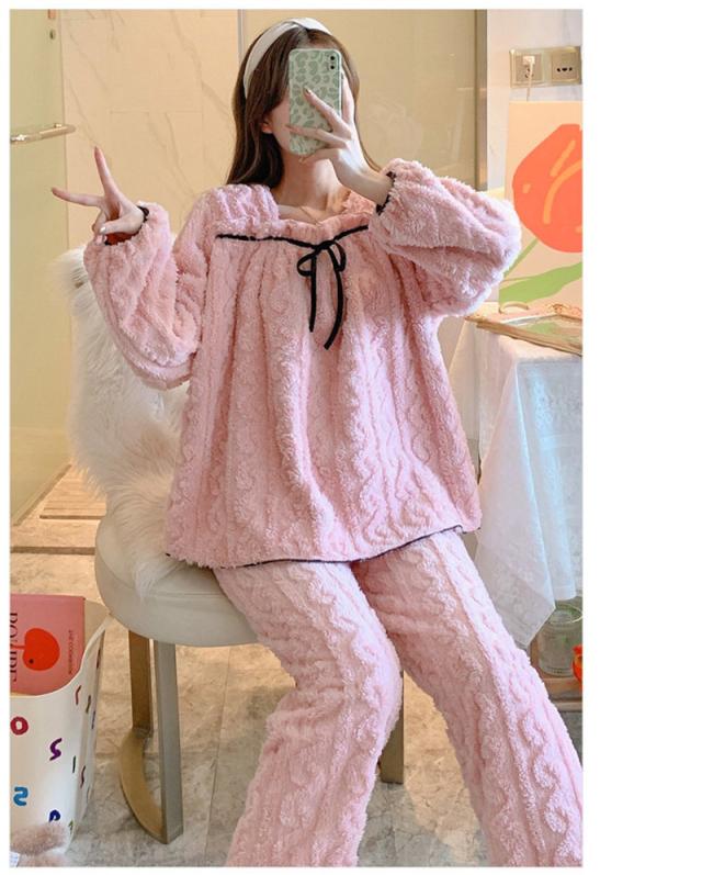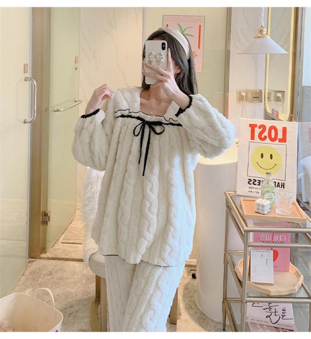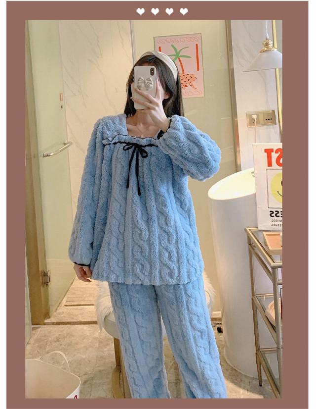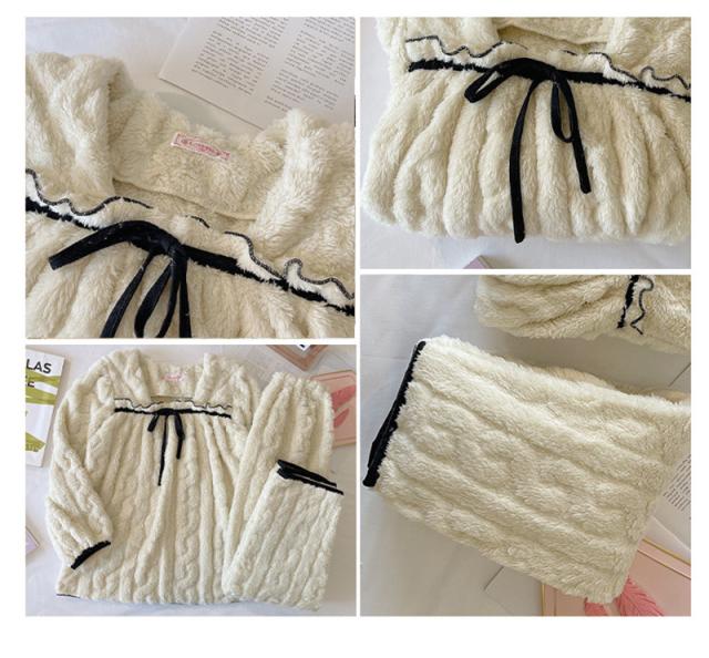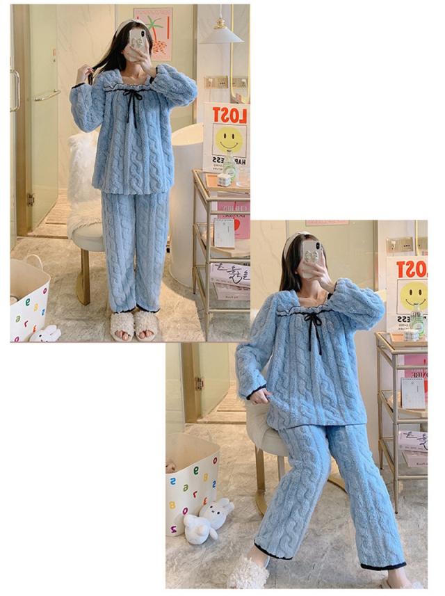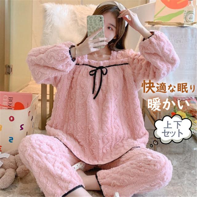 パジャマ 寝巻き セットアップ 上下セット レディース モコモコルームウェア 冬 リボン可愛い無地 暖かい 厚手 部屋着 ゆったり