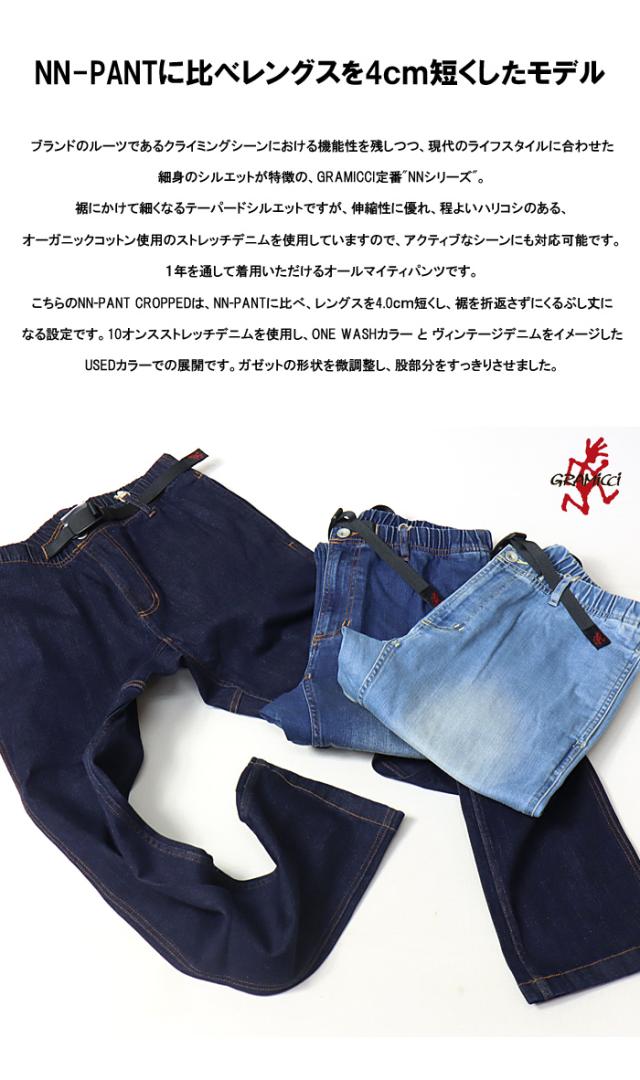ブランドのルーツであるクライミングシーンにおける機能性を残しつつ、現代のライフスタイルに合わせた細身のシルエットが特徴の、GRAMICCI定番"NNシリーズ"。裾にかけて細くなるテーパードシルエットですが、伸縮性に優れ、程よいハリコシのある、オーガニックコットン使用のストレッチデニムを使用していますので、アクティブなシーンにも対応可能です。1年を通して着用いただけるオールマイティパンツです。こちらのNN-PANT CROPPEDは、NN-PANTに比べ、レングスを4.0cm短くし、裾を折返さずにくるぶし丈になる設定です。10オンスストレッチデニムを使用し、ONE WASHカラー と ヴィンテージデニムをイメージしたUSEDカラーでの展開です。ガゼットの形状を微調整し、股部分をすっきりさせました。