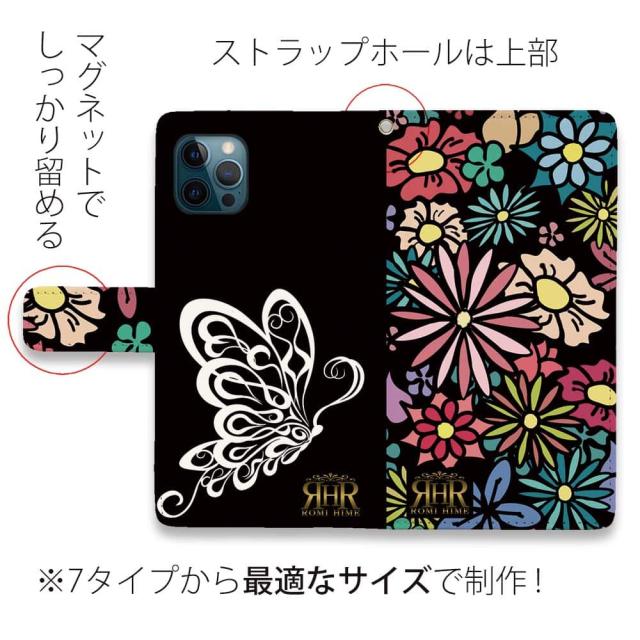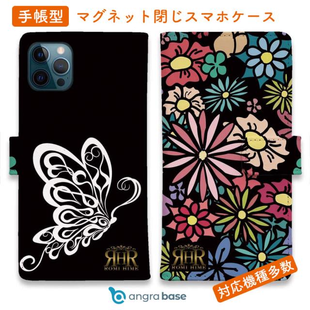 スマホケース 手帳型 カード収納 マグネット iPhone17 Pro Max iPhone Air iPhone16e iPhone16 Pro Max 16 Plus 15 Pro Max Xperia 10 VII Galaxy AQUOS ARROWS Pixel10 XL ROMI HIME 蝶 花 花柄 レトロ ブラック