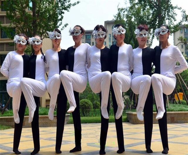◎【錯覚を利用したユニークタイツ♪】体の中心線から左右に黒と白で分かれているタイツなので、これを着て何人かで並ぶと1つの体のように見せることができます。