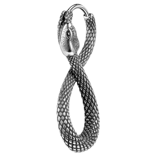 8の字に蜷局(とぐろ)を巻いた大きな蛇がモチーフのステンレスピアス。(※左右デザインの向きがございますが、お選びいただけません)