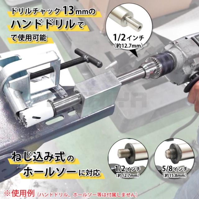 パイプ接続部の加工が簡単にきれいに出来る! ●パイプの加工(えぐる、ざぐる)が簡単にきれいに出来ます ●3/4インチ〜2インチまでのパイプの加工が可能です ●頑丈なスチール製 ●切削角度は60度まで調整可能 ●ドリルチャックが13mmのドリルを接続して切削します(ドリルは付属しません) ●ベンチバイスや作業台にしっかりと固定して使用してください ●土台部分のみお客様にてお取付けください(必要工具:13mm・14mmスパナ) 注意:ホールソーは付属していません (ホールソーは、ねじ込み式をご使用ください) ※ご使用には技術が必要になる為、製品の使用方法をご理解の上、お求め下さい (使用方法についての説明書は付属しません) ★「ホールソー」の販売ページはこちら 品番:PNC-2 |