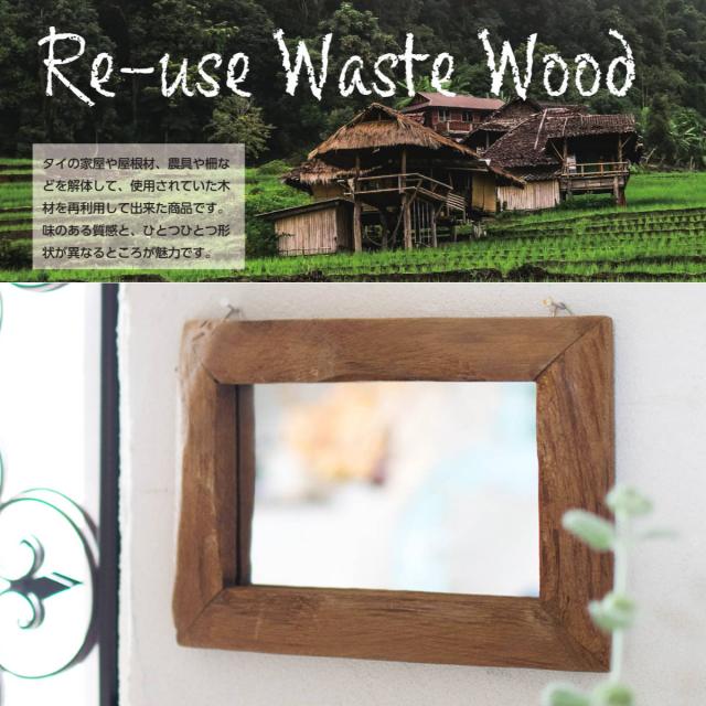 タイの家屋や屋根材、農具や柵などの廃材を再利用して作られた壁掛けウッドミラーです。フレームに天然素材の古材を使用しているため味のある質感と、ひとつひとつ色や模様、形や木目などが異なるところが魅力です。
