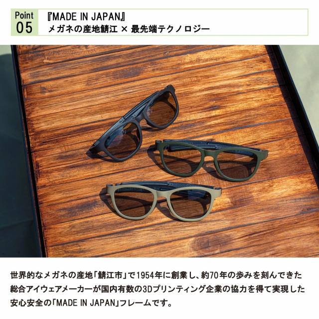 フル3Dプリンター製のフレームにこだわり、驚異の耐久性と絶妙なホールド感を実現。特殊蝶番の「ループヒンジ」によって10万回の開閉耐久試験をクリアした丈夫さ、マットなフレームによる無垢な手触り、男女問わず頭を柔らかく包み込む絶妙なフィット感が合わさった唯一無二のアウトドアサングラスです。