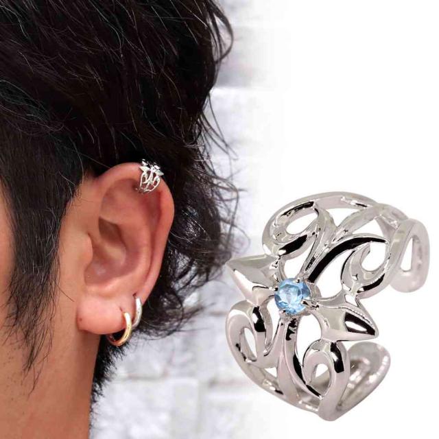 イヤーカフ 片耳用 メンズ ブルートパーズ イヤカフ クロス ノンホールピアス かっこいい 透かし 軟骨