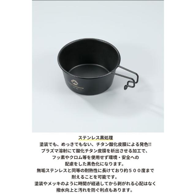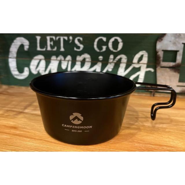 キャンピングムーン社のステンレス製シェラカップ BKS-360の単品です。 しっとりした、落ち着いたブラックは、酸化チタン皮膜を形成させた黒発色を施しています。