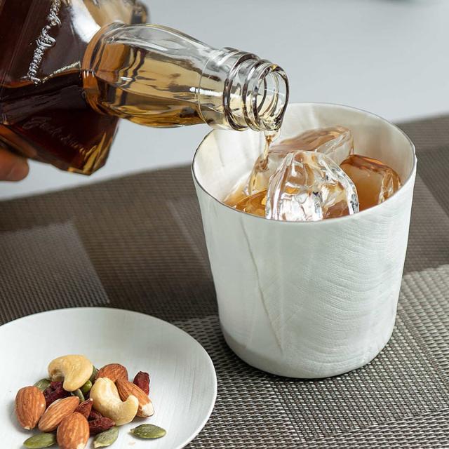 「布の真似をした磁器」という意味の「ceramic mimic fabric」というブランドのロックグラスです。昭和初期に誕生した当窯に代々伝わる「てびねり」製法により、亜麻の布を使って1つ1つ生地を”たたきしめる“ことでできる「布なり」のシワ感が特徴で、同じ文様が無い唯一無二の商品シリーズです。その中でこのロックグラスは、まさにロックを味わうためのグラス。やわらかに伝わる冷感とともに、大きめの氷と語らいながらまったりと過ごす時間を演出します。縁に金をあしらうことで控えめな華やかさをプラスしました。(白・ゴールド)/(白・プラチナ)/(黒・ゴールド)の3色からお選びいただけます。※1つ1つ手作業での生産のため、表面の布目は同じものはなく、サイズや重さに多少の差異があります。