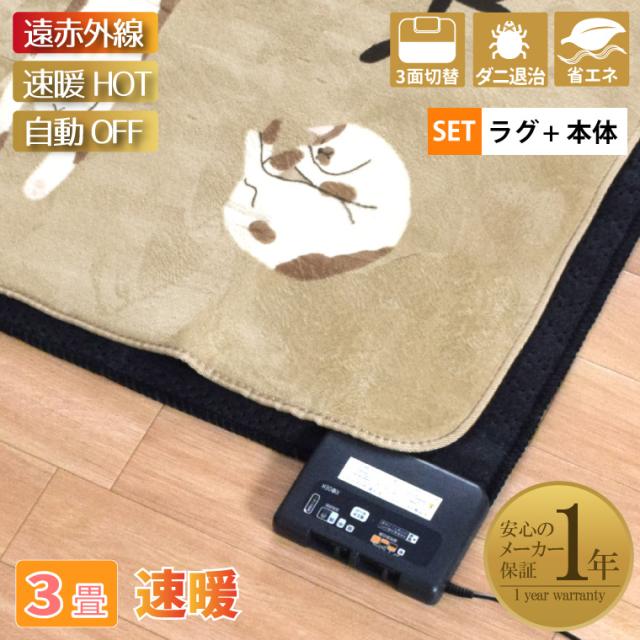 ホットカーペット 遠赤外線 速暖 3畳 カバー付き 2点セット 本体サイズ約195×235cm 10mm厚 ねこ柄フランネルラグ(カバー:約200×250cm) ベージュ 多機能搭載 メーカー1年保証 8時間自動オフ 省エネ 3面切り替え 24折収納 マイコン制御 コンパクト収納 電気カーペット 家電