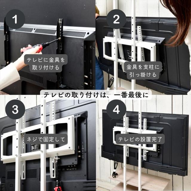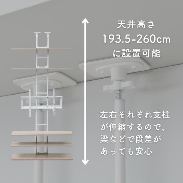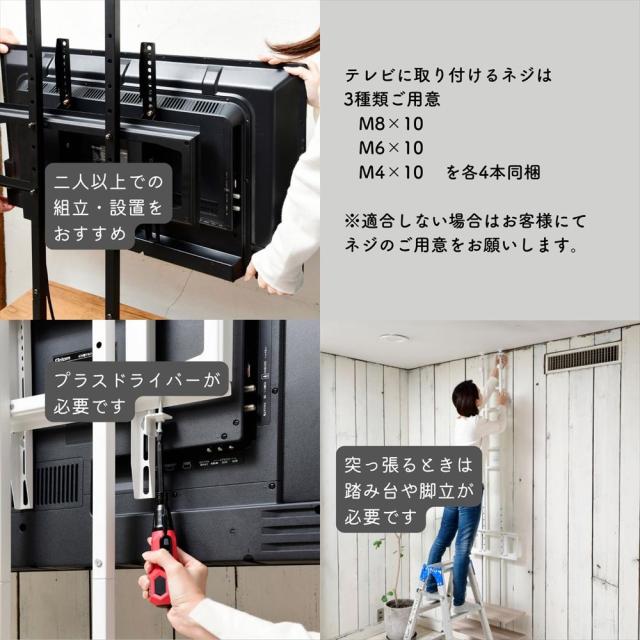 | 商品説明 | ※2人以上での組み立て推奨 ●薄い奥行で壁掛け風にテレビが置ける、突っ張りテレビ台 ●対応テレビサイズ:70型まで(50kgまで) ●天井高さ193.5-260cm対応 ●テレビに取り付けるネジは3種類ご用意:M8×10、M6×10、M4×10を各4本同梱(適合しない場合はお客様にてネジのご用意をお願いします。) ●テレビの高さは4段階で調整可能(床から金具下までの高さ65.5cm) ●耐荷重:テレビ収納部50、下棚10、最下段25kg、上棚3kg ●下棚サイズ:幅93 奥行25 上下間高さ15.5cm ●最下段サイズ:幅93 奥行30 高さ18.5cm ●上棚サイズ:幅93 奥行14.5 上下間高さ13/28cm ●下棚から上棚までの高さ:96/111/126cm |