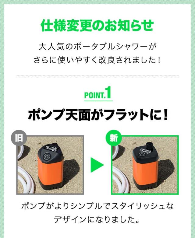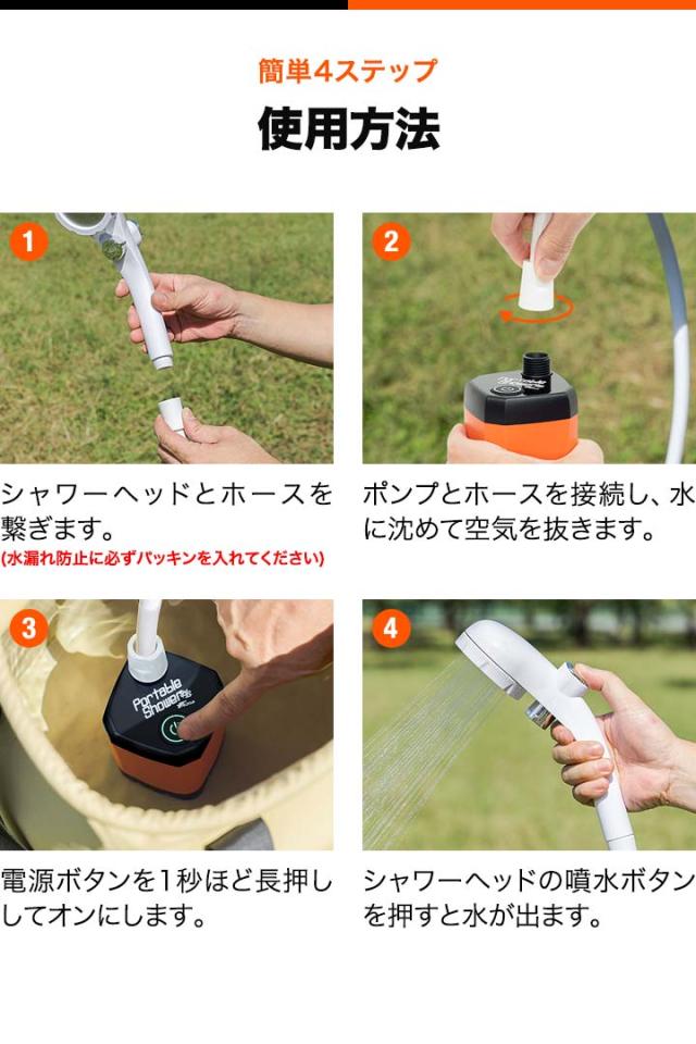 | 付属品: ポンプ、ホース、シャワーヘッド、USB Type-C充電ケーブル、ホルダー、ポーチ、パッキン(予備)×2個 |