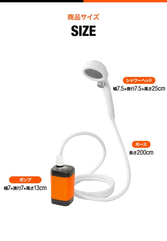| サイズ: ポンプ:(約)幅9.5cm×奥行11.5cm×高さ5cm シャワーヘッド:(約)幅6.5cm×奥行5.5cm×高さ20.5cm ホース:(約)200cm |