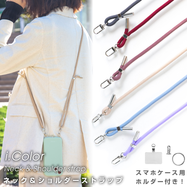送料無料 ショルダーストラップ スマホショルダー スマホ ロング ストラップ ストラップホルダー 長さ調節付き ホルダー付き 丸紐 おしゃれ カジュアル 落下防止 斜めがけ iphone ネックストラップ i.Color