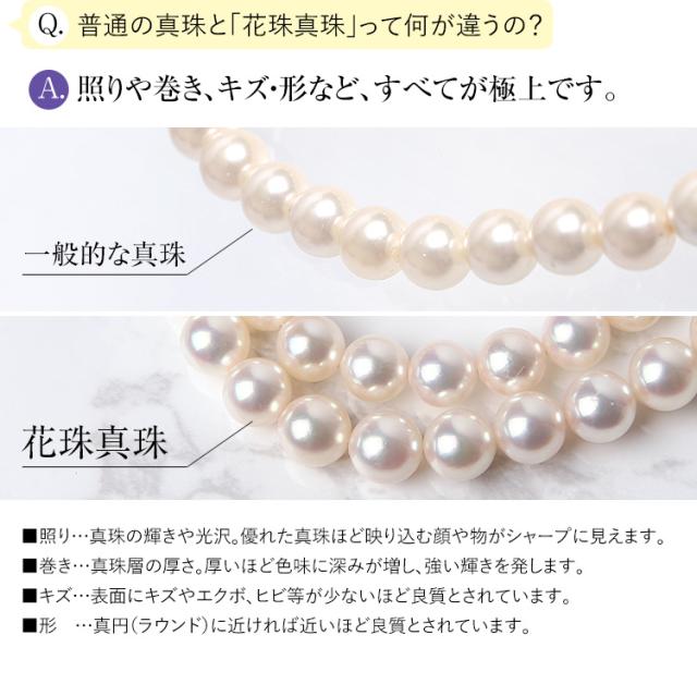 ・花珠真珠の極上の煌めきは核を取り囲む無数の真珠層から出来上がっており、光が真珠を通り抜け、照りと呼ばれる輝きを伴った複雑な色彩が生まれます。繊細な真珠層が厚く幾層にも重なりあった美しい照りは、鉱物の宝石では決して真似の出来ない究極の美しさが宿っています。