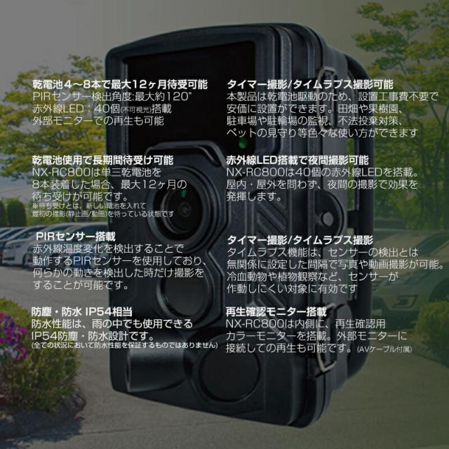 レンジャーカメラ NX-RC800(W) カメラ 動画 写真 タイムラプス 赤外線LED 人感センサー 防水 防犯 監視 観察 ![]() ![]() ![]() ![]() | ||||