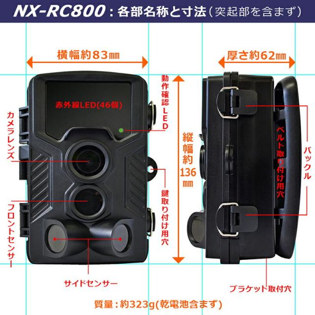 レンジャーカメラ NX-RC800 トレイルカメラ センサーカメラ 人感センサー 動物観測 クマ イノシシ 鹿 サル 熊 監視カメラ 観測 観察カメラ 防犯カメラ 動画 写真 トレールカメラ 防水 防塵 IP56 1080p 4k カメラ ビデオカメラ ボックス型SDカード LED F.R.C nxrc800