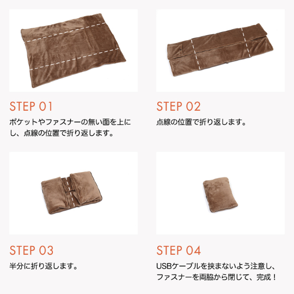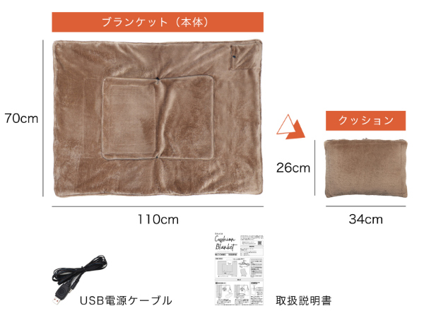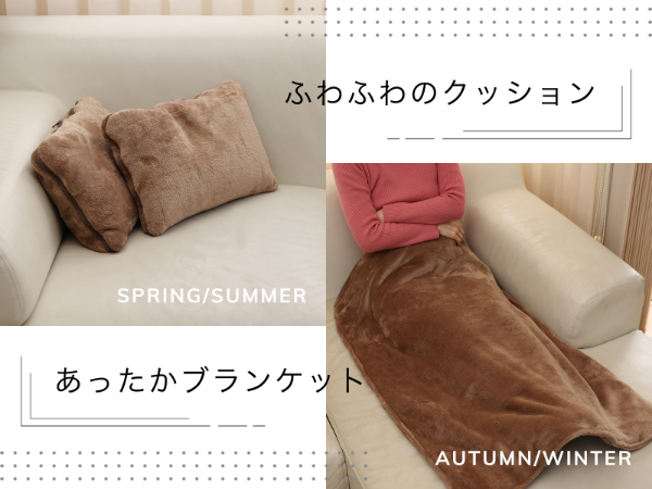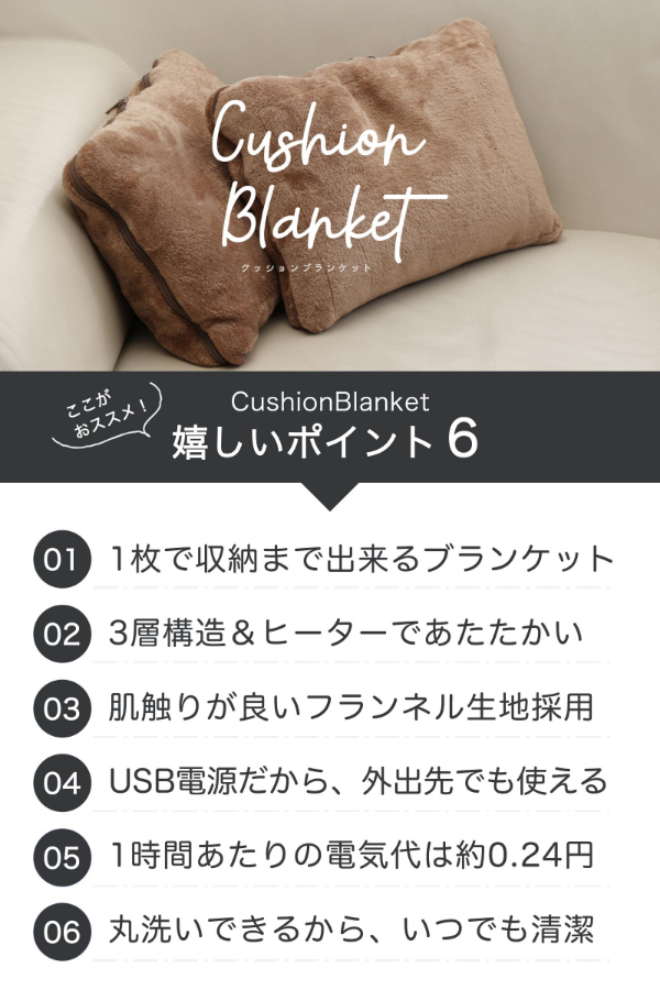 ●パッ!と広げてブランケット。シュッ!と閉じてクッションに!●心地良く滑らかな肌触りと保温性に優れたフランネル素材。●温かさを逃さない、3層構造×カーボン熱源。●カーボン熱源の遠赤外線効果で体中ぽかぽか。●ふわふわでぬくぬくと温かい設計になっています。冬はブランケット、夏はクッションと1年中使い分けて使用ができる2in1タイプのクッションブランケットです。ブランケットの使用後は、クッションとしてコンパクトにできるから、お部屋がキレイに片付きます。さらに、カーボン熱源搭載で、冬はぬくぬくとあたたかく、自宅だけでなく外出先でも1年を通して、快適にご使用頂けます。電源ケーブルを取り外すことで、本体の丸洗いができる仕様にいたしました。