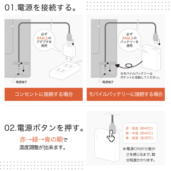 【型番】RLC-CHB01【サイズ(約)】●ブランケット:横110×縦70cm●クッション:横34×縦26cm【重量(約)】580g(本体のみ)【電源】USB入力 5V/1.8A【消費電力】9W【本体材質】ポリエステル【保証期間】購入日より本体6カ月間【付属品】取扱説明書、USBケーブル(1.8m)【注意事項】※クッションブランケットにバッテリーは内蔵しておりません。※USB電源アダプタ(2A以上)、モバイルバッテリー(2A以上)をお客様で別途ご用意お願いします。※2A未満(500mA、1Aなど)のUSB電源アダプタ、モバイルバッテリーでは、電力が足りないため使用できません。