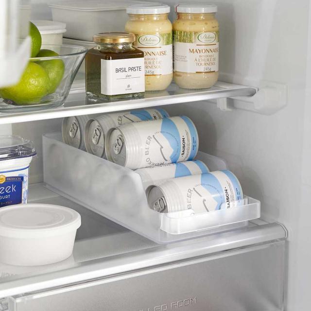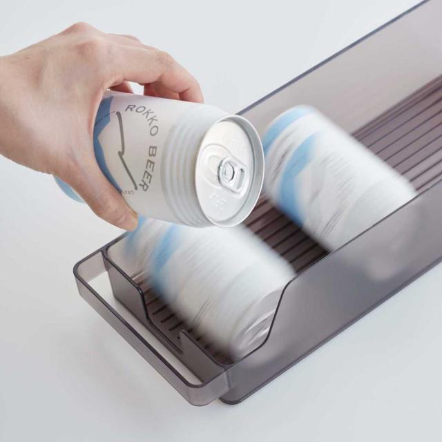 缶を1本取り出すごとに後ろの缶が出てくる缶ストッカーです。350ml缶は横置きで9本収納することができ、500mlのロング缶は縦置きで10本収納することができます。横置きで収納した場合、手前の缶を取ると後ろの缶が転がってくるので、冷蔵庫の置くまで手を伸ばす必要がなく取り出しやすいです。また、冷蔵庫の奥にあると取り出しにくいヨーグルトやバターなどの小物たちを収納しておくのもおすすめです。