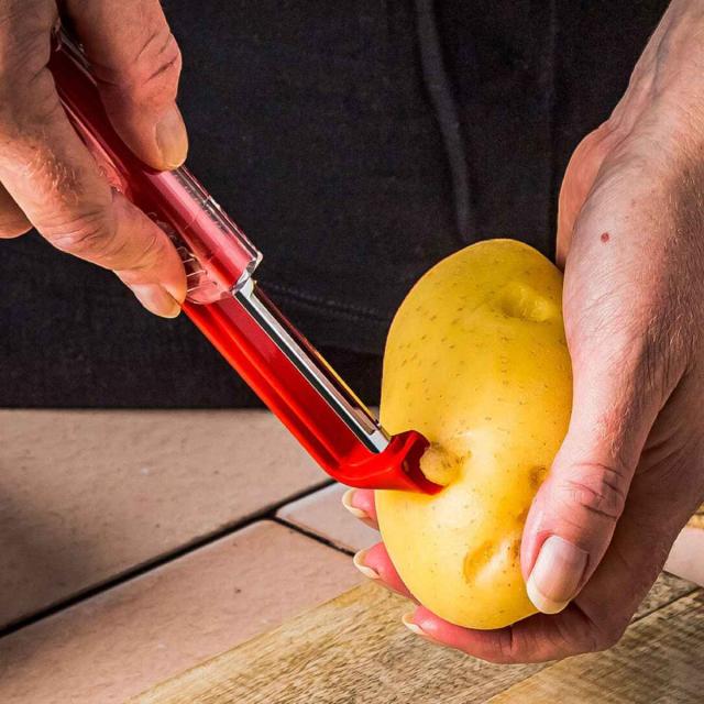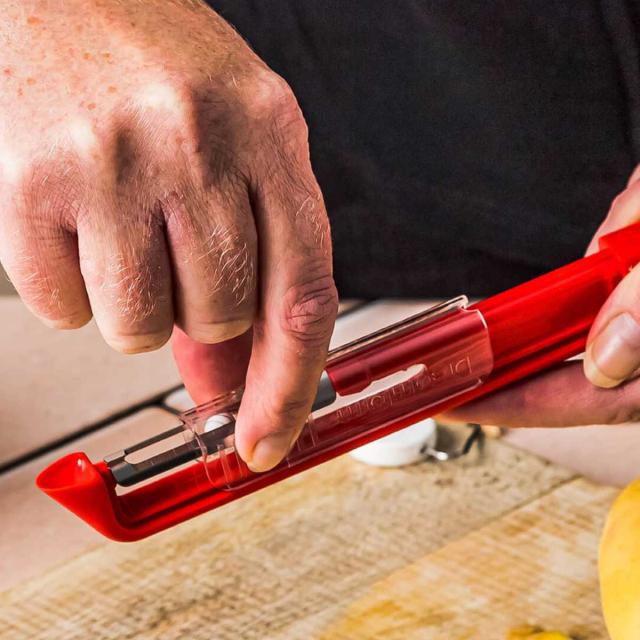 収納に便利なコンパクトサイズの縦型ピーラーです。小回りが利き、刃の角度を調整しすい為、小さい食材やじゃがいものような凹凸のある食材、トマトのような薄い皮の食材も簡単にむくことができます。また右利き・左利きどちらにも対応しているので、誰でも扱いやすくなっています。