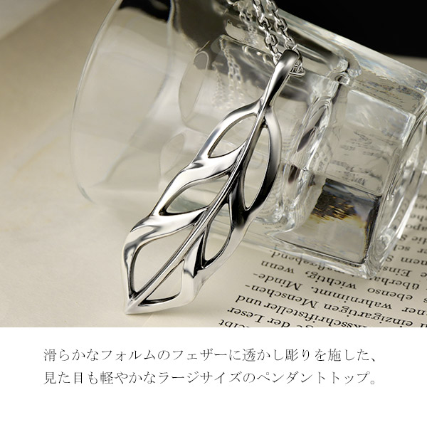 滑らかなフォルムのフェザーに透かし彫りを施した、見た目も軽やかなラージサイズのペンダントトップ。