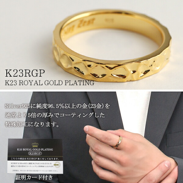 シルバー925に23金を通常の5倍の厚みでコーティングした“K23RGP”加工のリング。