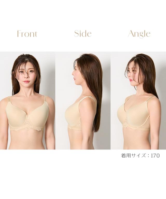 [keyword] レディース 下着 ランジェリー インナー 大きい胸専用サイズ FGHIJカップ対応 大きな胸 胸が大きい グラマー 標準サイズ 普通サイズ グラマーサイズ レース付き レーシー 脇すっきり 背中すっきり 段差 響きにくい ひびきにくい 響かない ひびかない シームレス 春 夏 秋 冬 [comment] 大きな胸でもキレイなラインをつくるモールドカップブラ。肩ひもにつながる長い角部分がしっかりバストを引き上げ、胸に沿って美しいシルエットに。前中心アンダーのゴムはV カットで胃にくいこみ