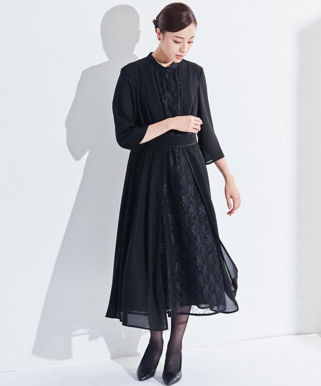 【喪服・礼服】<Callarus>日本製生地使用洗える防しわフロントレース切替デザインワンピース<大きいサイズ有>