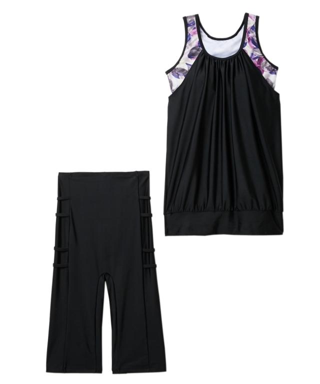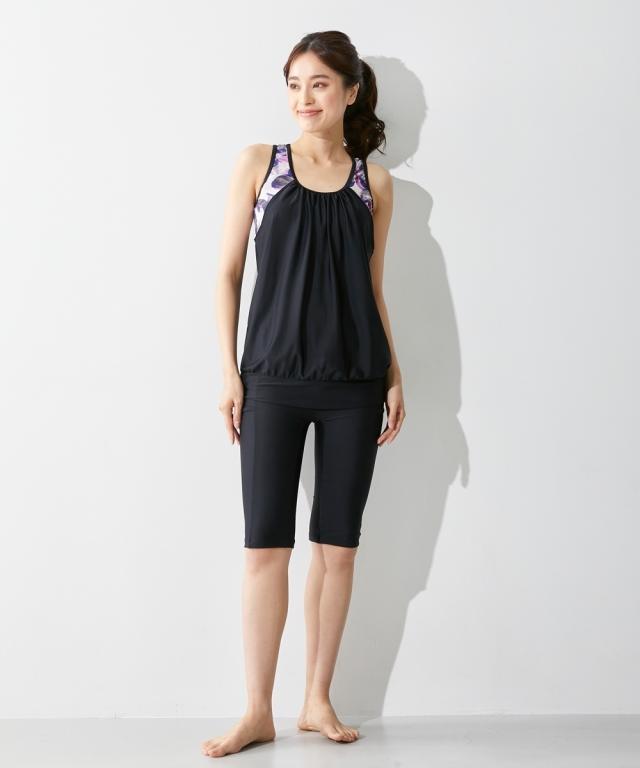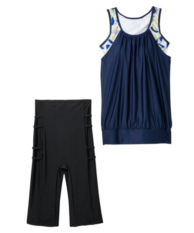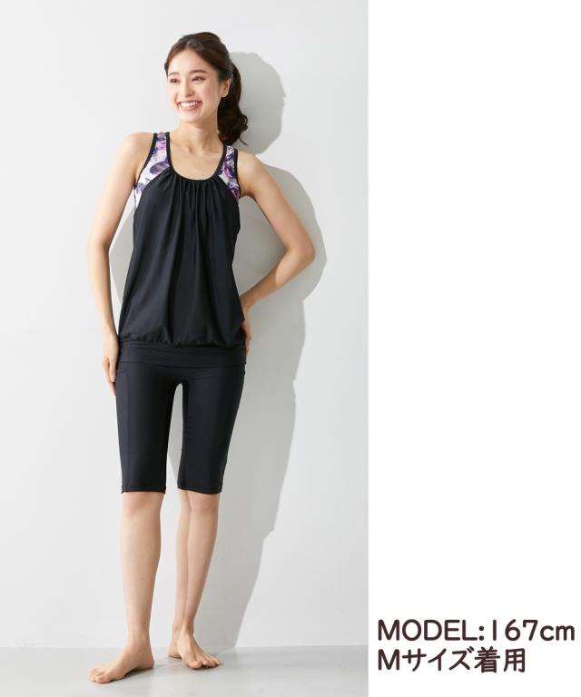 お腹周りをふわっとカバーしてくれる体型カバー水着上下セット。トップスとボトムを固定するめくれ防止機能付きなので、トップスのめくれ上がりでお腹が丸出しになる心配もナシ ボトムは全面裏地付きなので安心の着用感です。