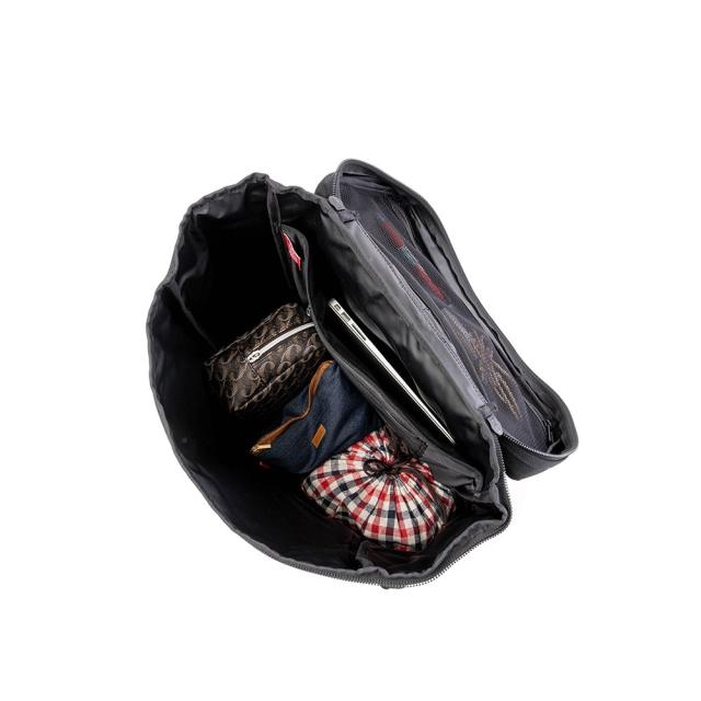 前面にファスナーポケット、側面にファスナーポケットとオープンポケット、上部にオープンポケットと豊富なポケットを有しています。また、メインルーム内にも15インチ程度のPCを収納できるポケットや、ファスナーポケットを装備しています。