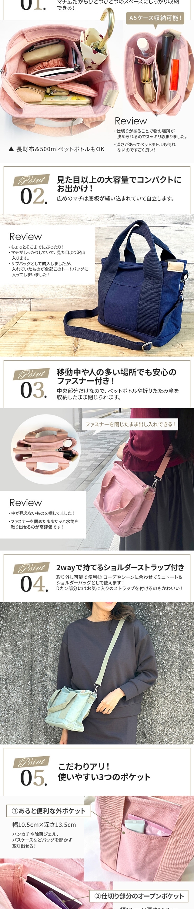 - ミニトートショルダーを探していて、ちょうどいい大きさでした。中もポケットがあったり仕切りがあって整理しやすく重宝しています!