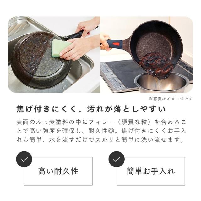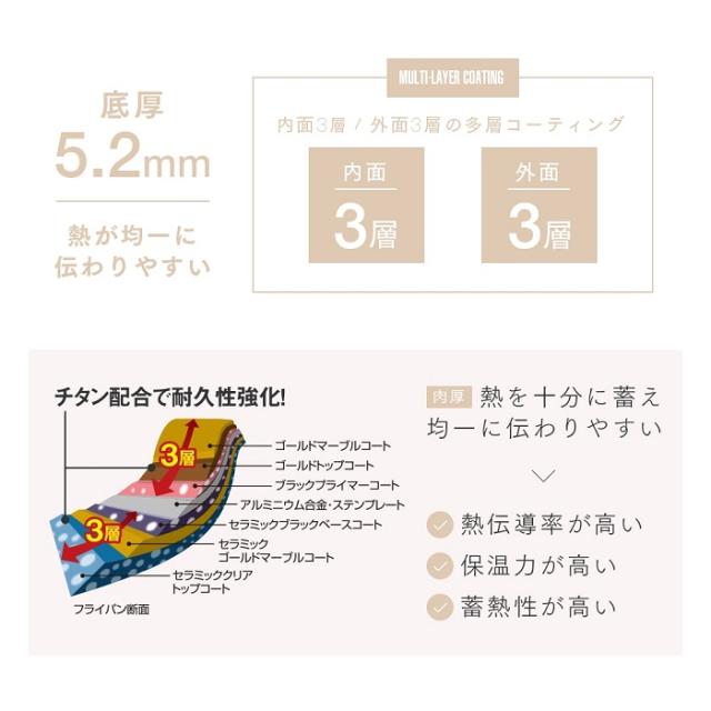 内面3層、外面3層のキズつきにくい多層コートで、焦げ付いても水を入れるとスルリと落ちやすい。 <