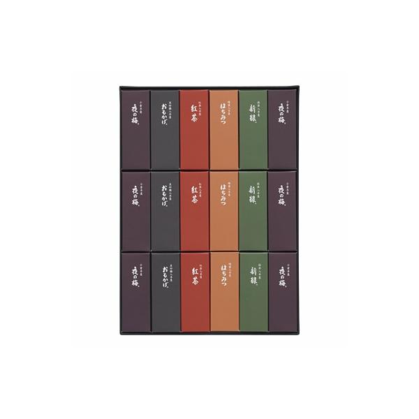 内容 : 夜の梅(小倉羊羹)6本、おもかげ(黒砂糖入羊羹)3本、新緑(抹茶入羊羹)3本、はちみつ(蜂蜜入羊羹)3本、紅茶(紅茶入羊羹)3本各50g