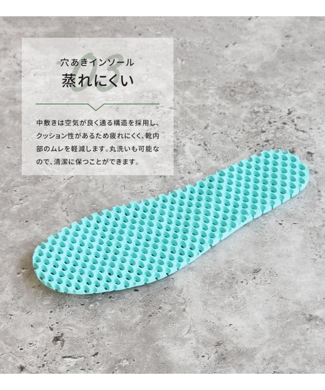 中敷きは空気が良く通る構造を採用し、クッション性があるため疲れにくく、靴内部のムレを軽減します。
