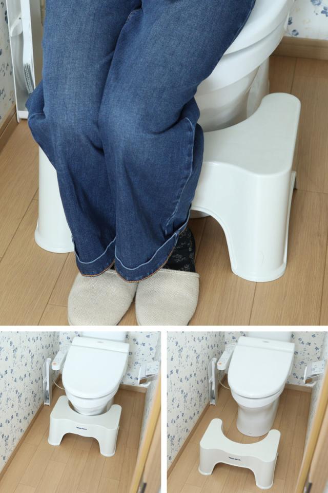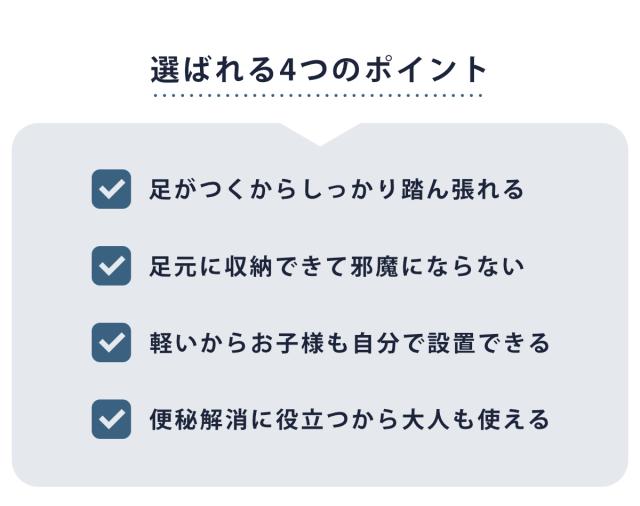 足を乗せるだけで和式トイレのような姿勢に。直腸がまっすぐ伸び、自然な腹圧がかかるので楽に排便できます。お子様だけでなく家族みんなでご使用いただけます。