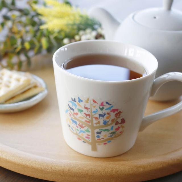 「温感マグ フォレストライフ」は温度で色が変化する、美濃焼のマグカップです。温かい飲み物を注ぐと、黒い木のシルエットから動物や鳥、魚など様々な生物が姿を現します。45℃以上で色が変化し、常温になると元の黒色にもどります。一本の大きな木に集まるカラフルな生き物たちの絵柄がとてもおしゃれです。SDGsをはじめ自然や環境問題に対する意識が世界的に高まってきている中、海や森、限りある資源を大切にしつつ、豊かな自然を育みながら地球と共存していけるよう願いを込めて海洋生物、大陸生物、鳥類などをデザインしました。艶のあるやわらかな乳白色のマグカップが、優しい時間を演出してくれます。令和三年度一般社団法人岐阜県観光連盟観光土産品審査会 奨励賞受賞商品です。※ペアセットではなくカップ1個の販売です。