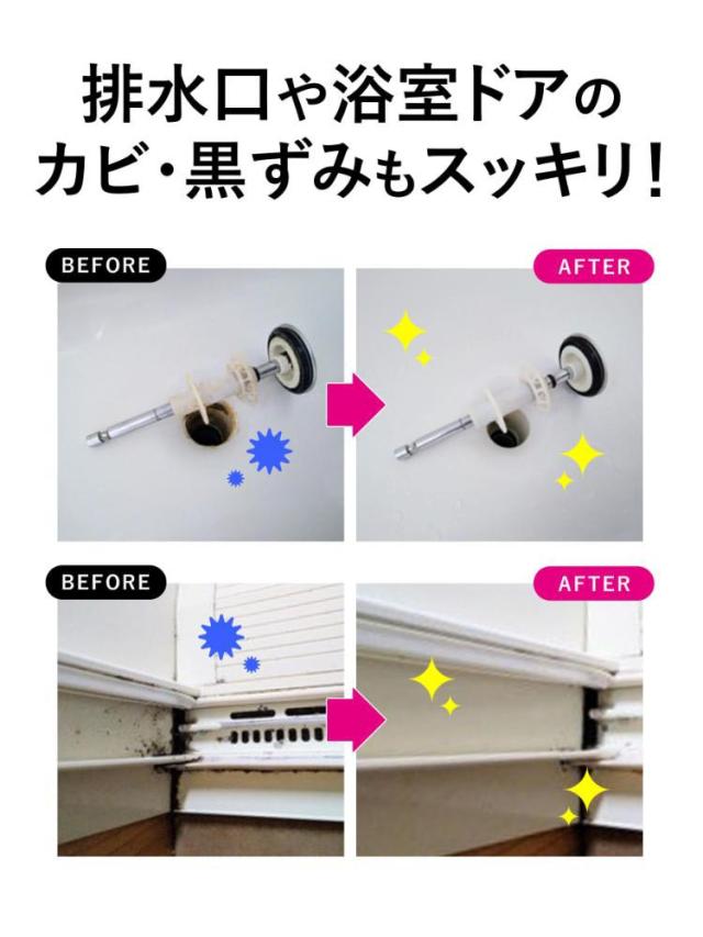 | 用途:浴室内のカビ汚れの除去(壁、タイル、目地、小物類、シャワーカーテン、浴室扉等のゴムパッキンなど) 使用できません:アクリル、ABS、ポリカーボネート、アルミ、銅、真ちゅう、木製品、獣毛のハケ・ブラシ、水洗いできない箇所(大理石・人工大理石、外国製タイルやユニットバスの使用の可否はメーカーにご確認ください) |