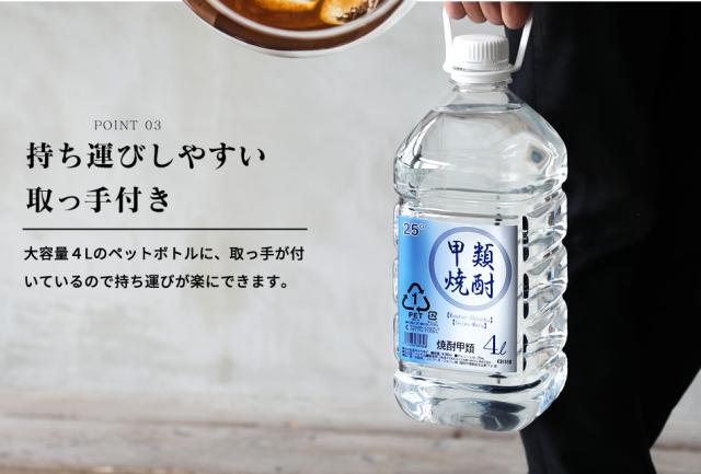 焼酎甲類の最大の特性でもある『自由度の高さ』です。焼酎の特徴である糖質・プリン体でゼロで体に優しさに加え、安く提供可能です。 大人気の4リットル(4l)サイズで持ち運びに便利な取っ手がついてます。