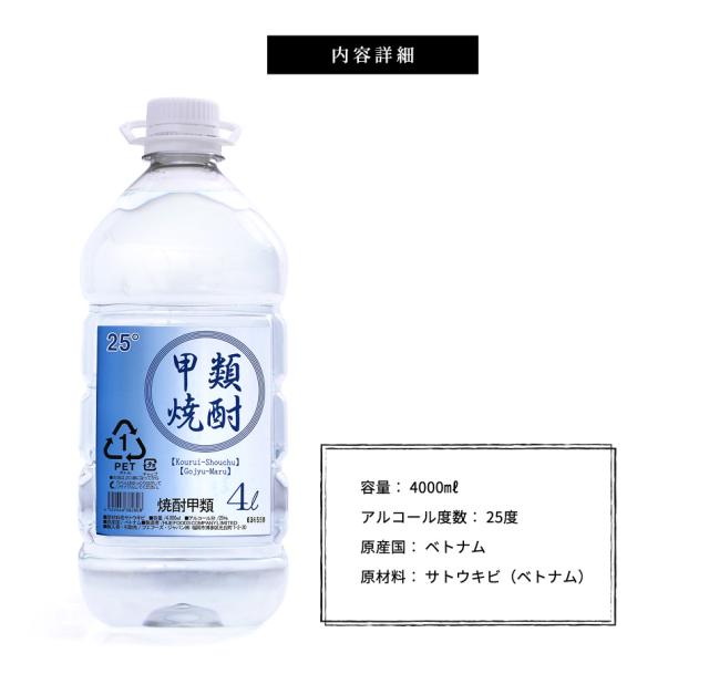 焼酎 4リットル 25度 ケース 甲類焼酎 4l 4本 お買い得 大容量 送料無料 糖質オフ プリン体ゼロ 糖質ゼロ レモンサワー用 梅酒用 果実酒用 まとめ買い 焼酎ハイボール用 ホワイトリカー
